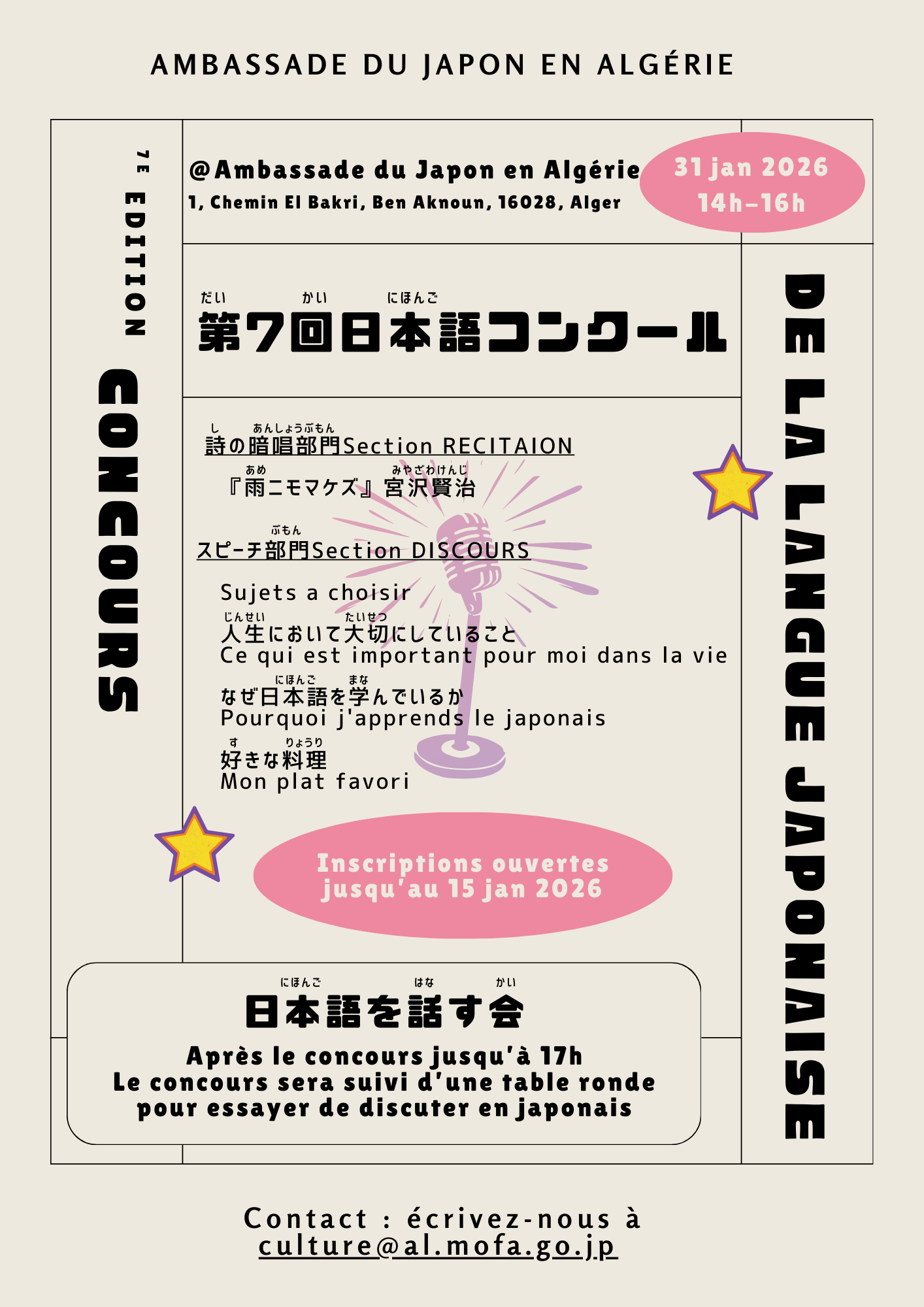 Nous avons le plaisir de vous annoncer la tenue du 7e édition du concours de la langue japonaise. Le concours se tiendra le 31 janvier 2026 à 14h, à l’Ambassade du Japon en Algérie. Le concours se déroulera en deux sections : section RECITATION et section DISCOURS. Les candidats peuvent choisir une des deux sections selon leur niveau de japonais. Les détails sont comme suit :